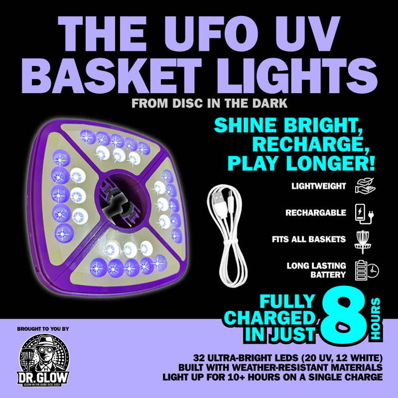 The UFO UV Basket Light from Disc In The Dark delivers the best of both worlds: Bright, cool white LEDs that make the basket visible from over 400 feet, and built-in UV “black lights” that actively recharge glow discs when they land in or near the basket. Whether you’re lining up a long putt or retrieving your disc after the shot, this dual-light system keeps the action visible (and your discs glowing) through every hole!